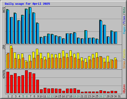 | Day | Hits | Files | Pages | Visits | Sites | KBytes | ||||||